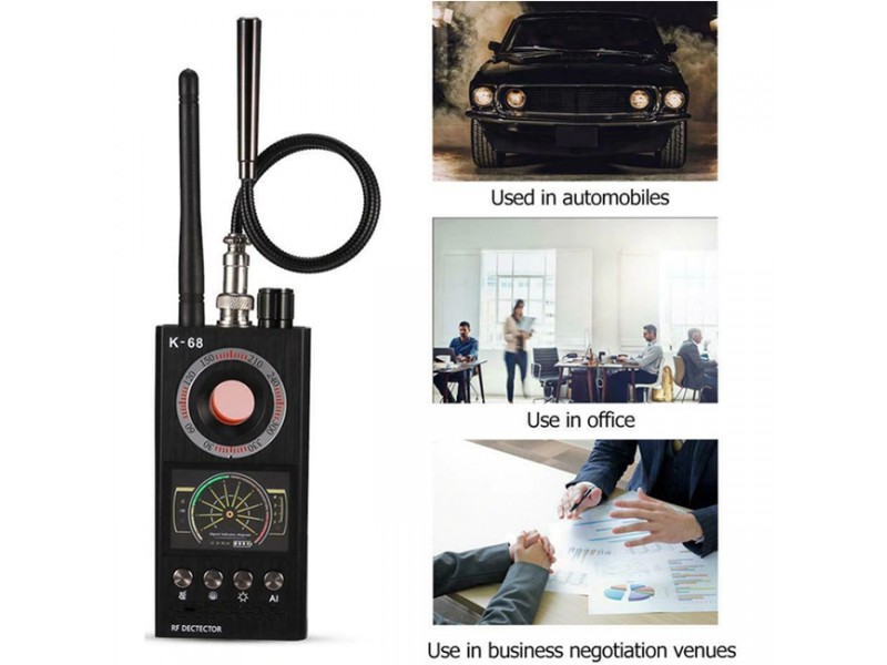 Bạn muốn kiểm tra không gian xung quanh mình như: phòng họp, phòng ngủ, xe ô tô hay khu vực bạn ngồi làm việc với đối tác có máy nghe lén, thiết bị định vị theo dõi, camera ngụy trang hay không? Bạn chỉ cần đặt thiết bị phát hiện quay lén K68 trong không gian đó. Khi phát hiện tín hiệu máy có thể báo hiệu bằng ánh sáng, âm thanh hoặc báo rung để cho người sử dụng biết (tùy lựa chọn báo hiệu). Đi kèm với máy là antena thu tín hiệu và một antena tích hợp đèn, khi dưa gần nguồn tín hiệu phát, đèn sẽ sáng cho người sử dụng biết được vị trí đó khả nghi nhất.